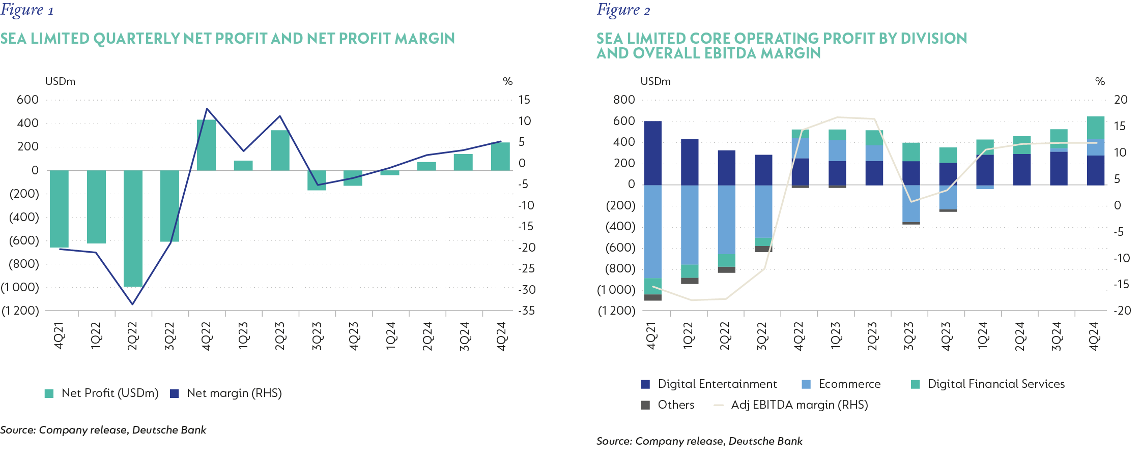Other material positive contributors were MercadoLibre (MELI; 15% return, 0.6% positive contribution), JD.com (18% return, 0.5% contribution) and Tencent Music Entertainment (26% return, 0.5% contribution). In the case of MELI, the positive share price movement was a reversal of what we saw in the fourth quarter, with the Brazilian real strengthening (Brazil is its most important market) and Argentina continuing its stabilisation programme under the Milei government. In the fourth quarter, MELI saw revenue grow 37% YoY, with Brazil up 38% and Mexico up 43% (both YoY). Net income for the quarter was almost 4 times higher than that of the comparable quarter in 2023. MELI continues to grow its market share in a growing market despite its already large size. Its years of investment into growing its ecosystem of sellers as well as improving its logistics and fulfilment capabilities (getting packages to buyers) have seen its market share increase to 42%. SEA's competing Shopee operation has also grown its market share strongly in Brazil and is now the number two player, having overtaken Magazine Luiza.