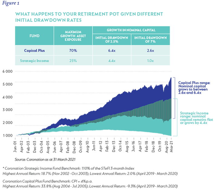 Each shaded section shows the range in which your living annuity balance would have moved for starting drawdown rates of 2.5% and 7% a year respectively. The analysis is for the period July 2001 (when both funds were launched) to 31 March 2021. Over this period, the average money market fund returned 7.7% p.a. (after fees), while Strategic Income delivered 9.8%* (after fees) p.a. Capital Plus returned 11.4%* (after fees) p.a. over the same