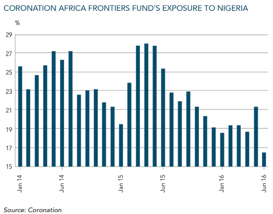 As the oil price started falling in the second half of 2014, equity valuations began to look stretched and our earnings forecasts started to decline. We took a decision to reduce our Nigerian exposure from a high of 27.4% of our Africa Frontiers Fund in July 2014 to 19.6% in January 2015.