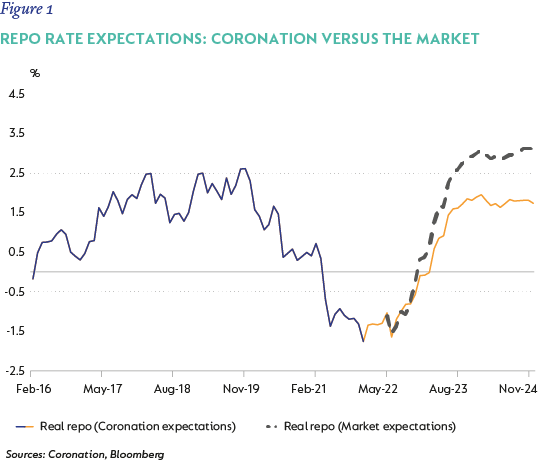 SA headline inflation surprised significantly to the upside in May, and remained well above the top end of the target band in June. Food was the most significant upside surprise, suggesting that second round effects might prove worrisome. Our expectations are for CPI to continue its upward trajectory, breaching 8% and staying above the top end of the inflation band (6%) for at least the next 12 months. We now expect the South African Reserve Bank (SARB) to continue hiking rates in 50bps increments for the next two meetings before reverting to 25bps, taking the repo rate to 6.75% (previous 6.5%). Our expectations are for CPI to average 5.3% in 2023 and 4.5% in 2024; however, the risks remain to the upside. Current market pricing already encapsulates a significant inflation premium, suggesting a repo rate of between 7.5% to 8% by end-2023. This would imply a real repo rate, based on current inflation expectations, of 3% higher than SARB’s own 2.1% and our expectation of real repo at 1.5% to 2% (Figure 1).